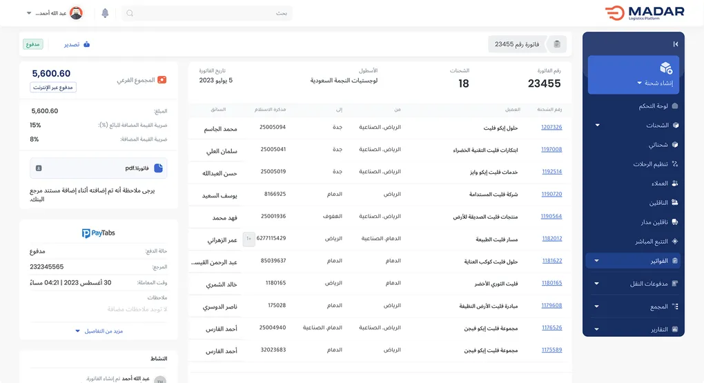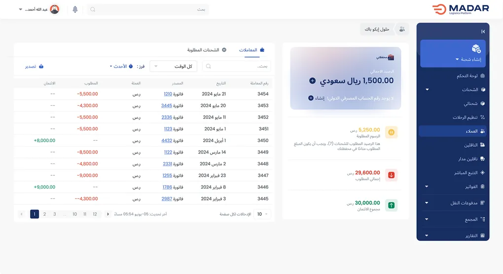 من خلال محفظة إلكترونية موحّدة، تُمكّنك مدار من إدارة جميع المدفوعات بفعالية، مع تتبع دقيق لكل معاملة وربطها بعمليات الشحن والفوترة ذات الصلة.