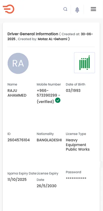 مدار تتحقق تلقائيًا من أهلية السائقين من خلال مراجعة الجواز، الهوية، الرخصة، وغيرها من الوثائق الأساسية لضمان الالتزام الكامل. وتوفر لك وصولًا فوريًا لكل التفاصيل المهمة مثل الجنسية، تاريخ الميلاد، ومعلومات جهة العمل.