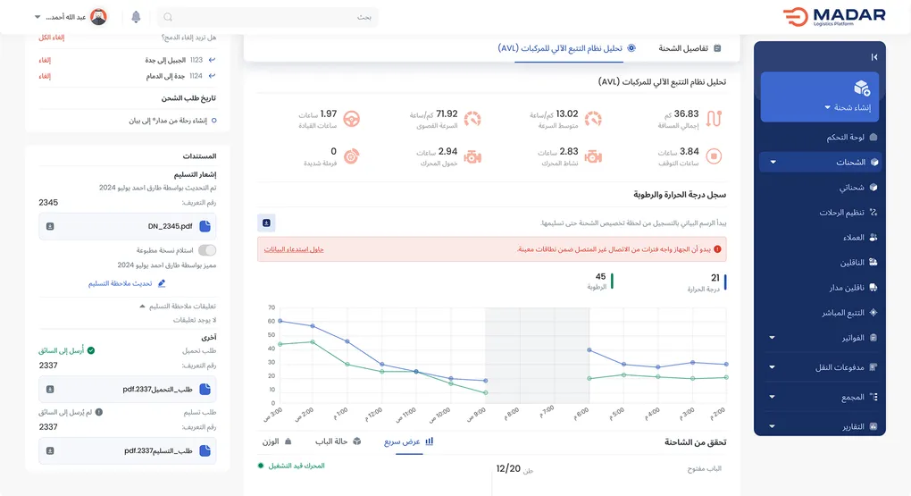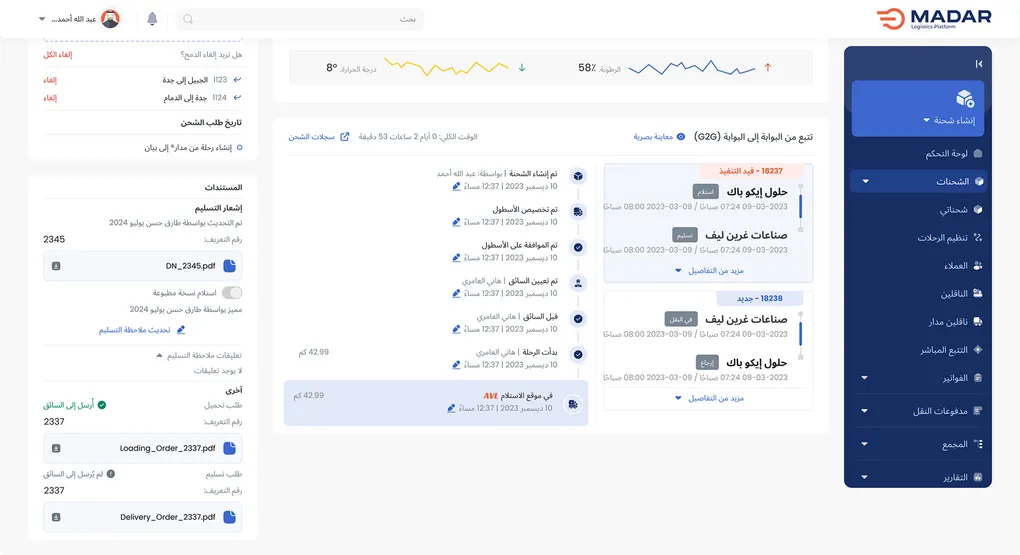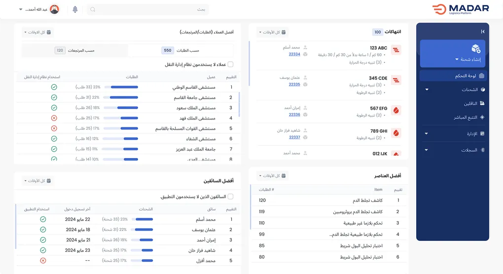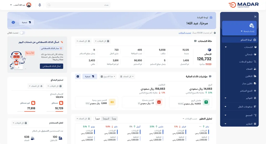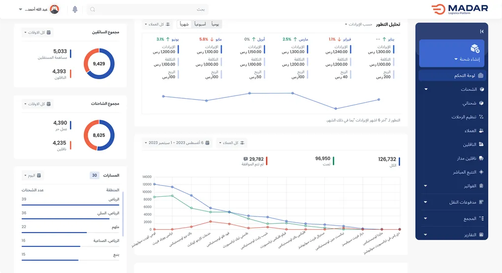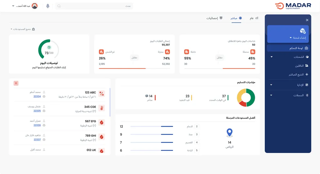 تحكّم بكامل عملياتك اللوجستية بثقة وذكاء مع لوحة التحكم المركزية من مدار — أداة متكاملة تمنحك رؤية فورية للشحنات، وتنفيذًا سلسًا للطلبات، وإدارة فعّالة لعمليات التحميل والتفريغ، مدعومة ببيانات لحظية.