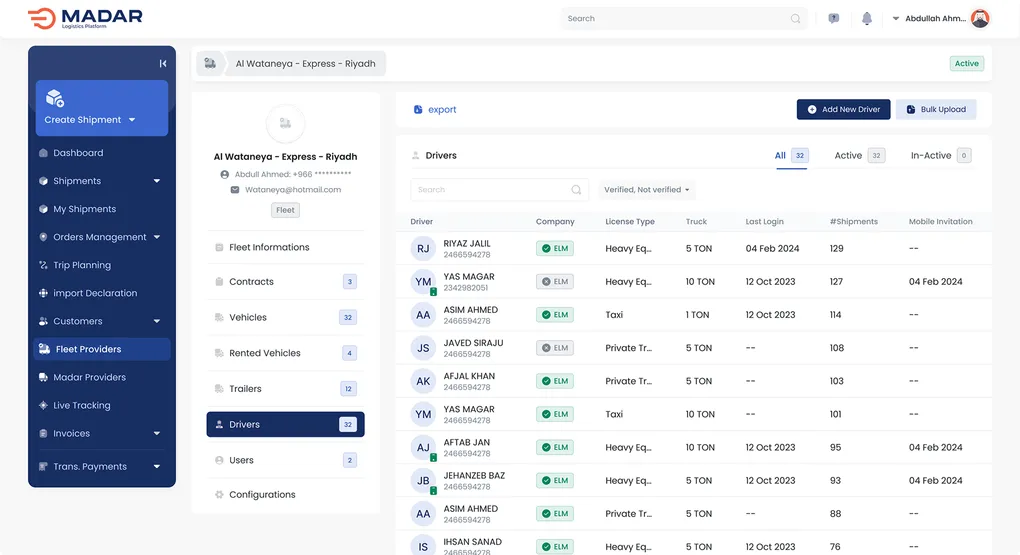Madar allows linking a truck to a particular driver for easy monitoring and management. Immediately access key data for both without having to deal with separate records and link them manually in a third-party system. Get a complete insight into the truck's registration, operating card validity, technical condition, location, and performance, as well as verified driver data, including driver’s ID, work permit, and track record.